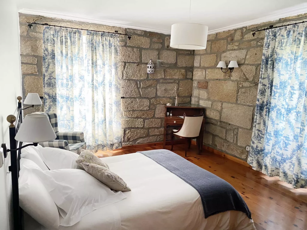 Habitación con cama doble, bañera y vistas al valle de Melgaço, los viñedos y sus mágicos rincones. La decoración de la habitación, elegante, sosegada y acogedora, permite sumergirse en la tranquilidad que solo un entorno como el Pazo de Almuiña puede ofrecer.